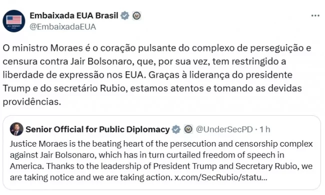 Darren Beattie, subsecretário de Diplomacia Pública, afirmou em postagem na rede social X que as ações de Moraes cerceiam a liberdade de expressão, inclusive nos Estados Unidos. “O Juiz Moraes é o coração pulsante do complexo de perseguição e censura contra Jair Bolsonaro, que por sua vez cerceou a liberdade de expressão nos Estados Unidos. Graças à liderança do Presidente Trump e do Secretário Rubio, estamos atentos e tomando medidas”, escreveu. A declaração ecoa a narrativa de Rubio, que acusou Moraes de extrapolar as fronteiras brasileiras ao impor restrições que afetam empresas americanas, como a rede social X, bloqueada no Brasil em 2024 por ordem do STF.