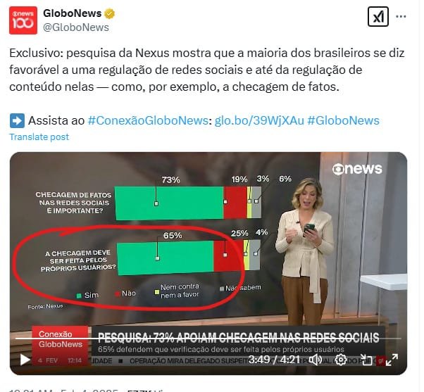 Aí você abre a pesquisa e vem a sacanagem. Dos 60% que se mostram favoráveis a uma regulação, 50% destes dizem que só são favoráveis se não houver limitação à liberdade de expressão. 🤡
