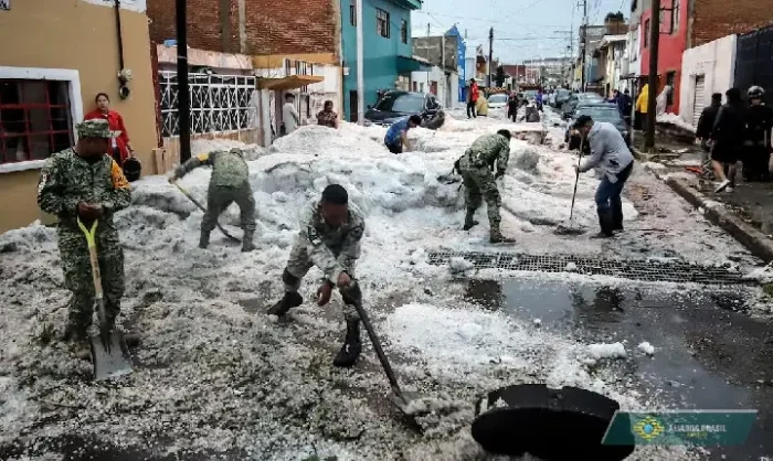 Uma tempestade de granizo inesperada surpreendeu os moradores da região de Puebla, no México, deixando as ruas cobertas por uma espessa camada de gelo após um período de calor extremo.